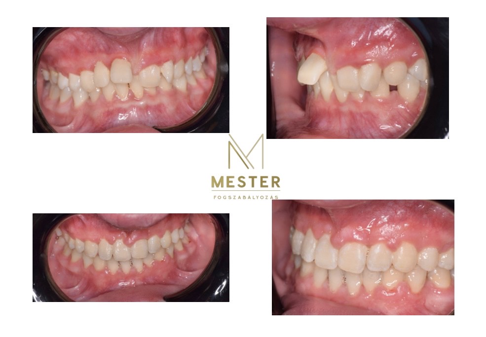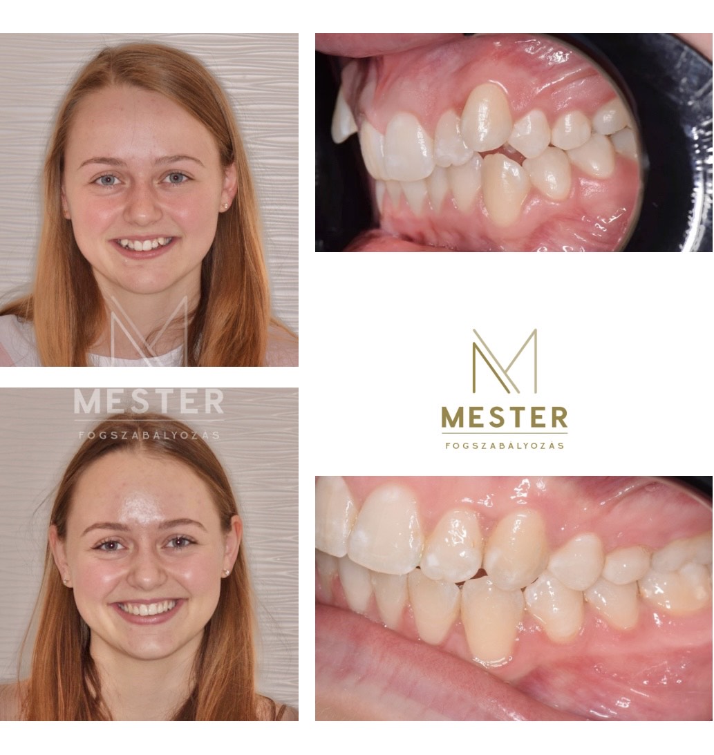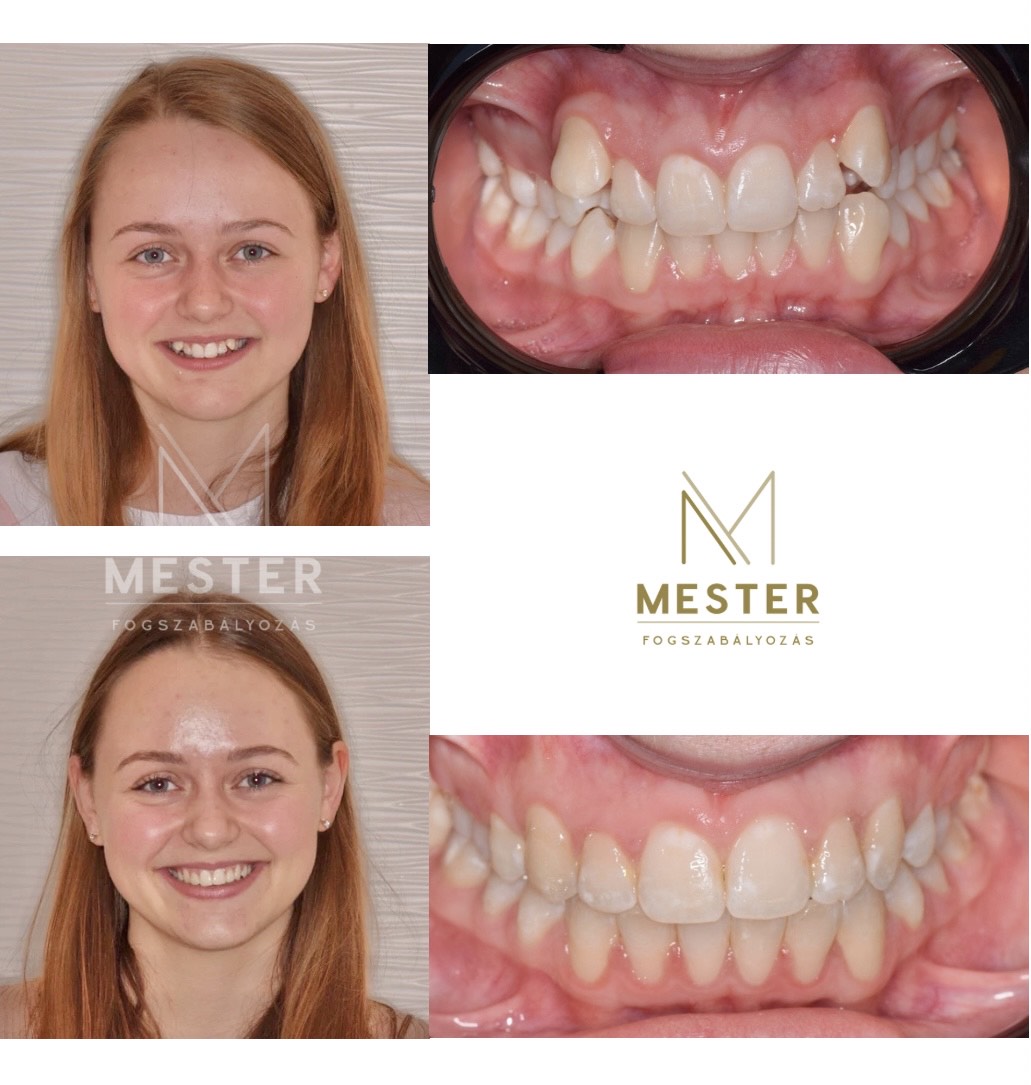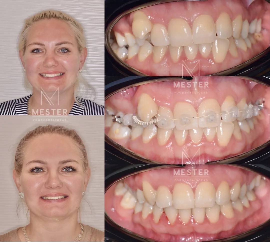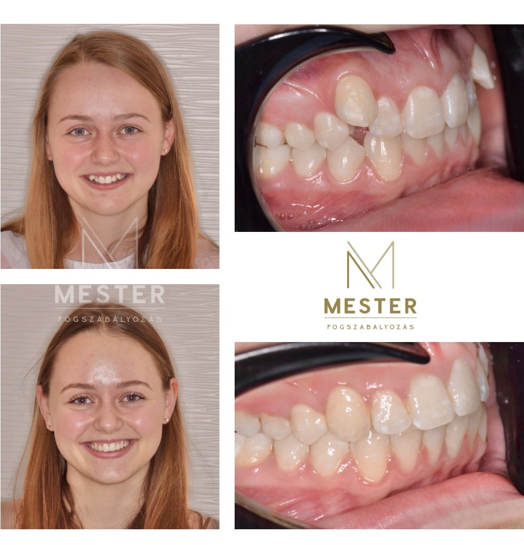 1. eset: Páciensük soron kívüli szemfoggal (ektópiás szemfog) érkezett hozzánk. Kezelését, ami 18 hónapig tartott, foghúzás nélkül végeztük Damon Clear esztétikus önligírozó rendszerrel.