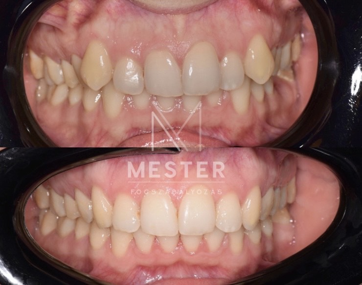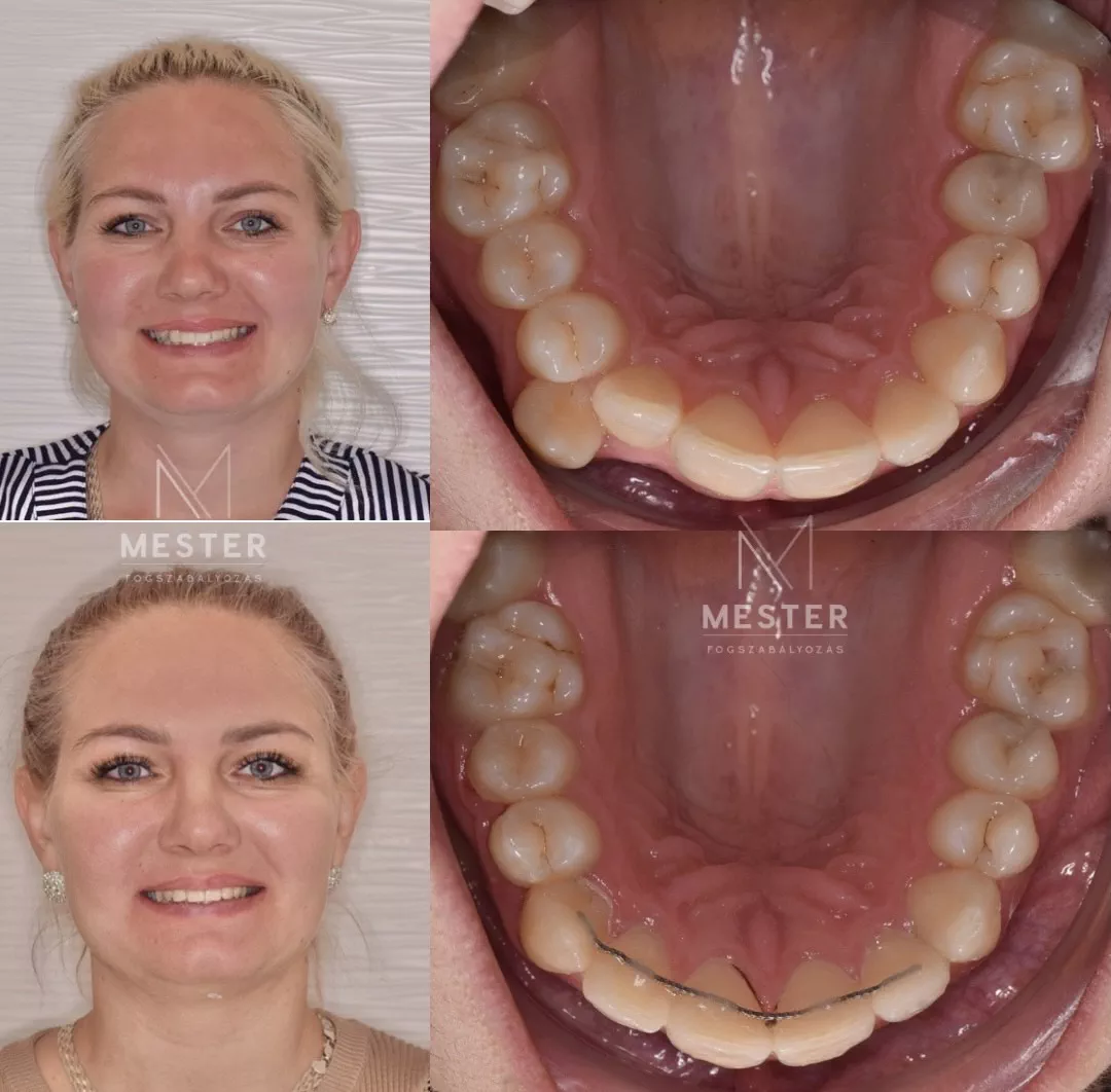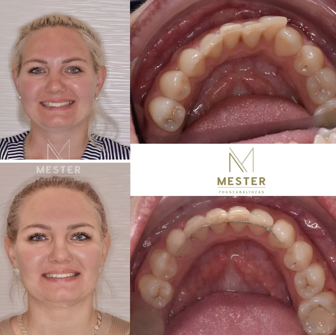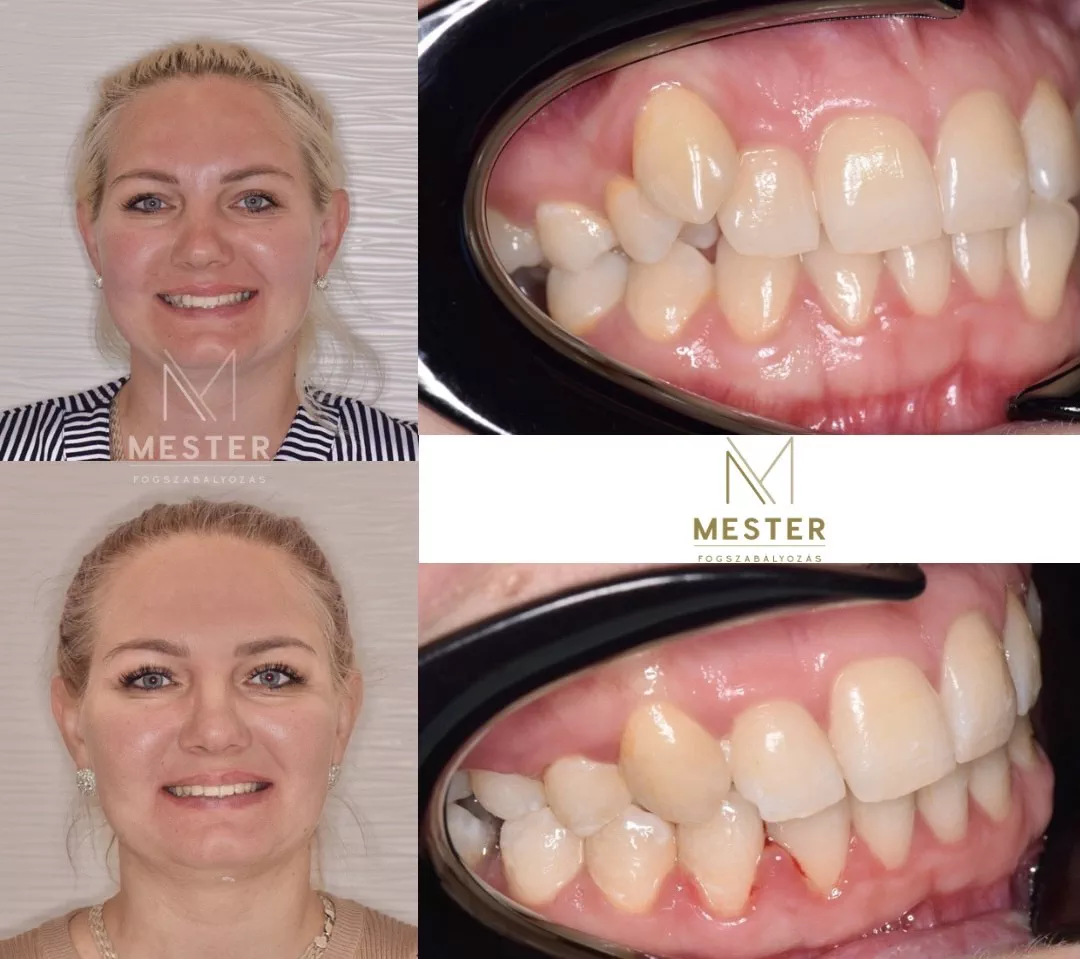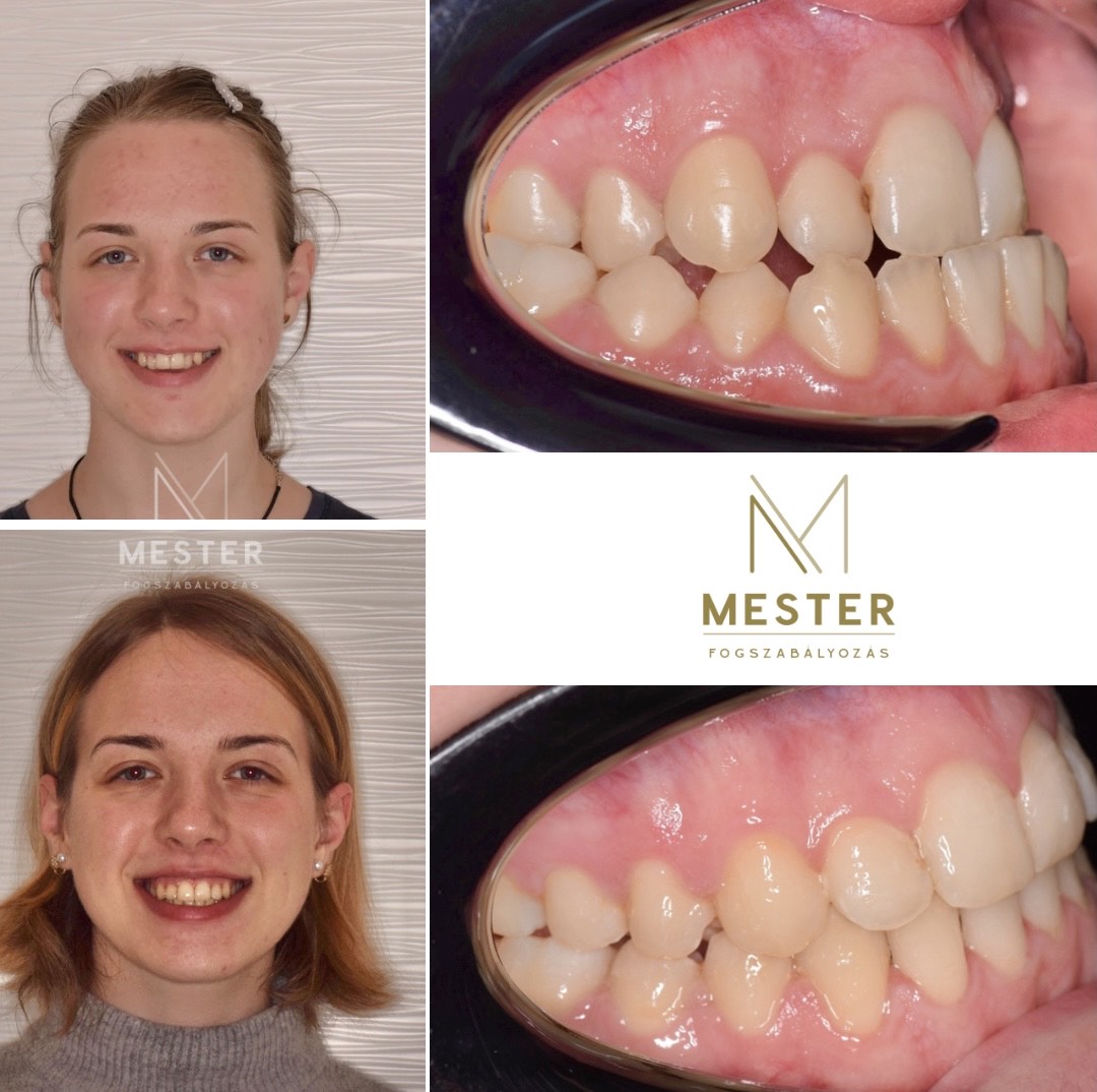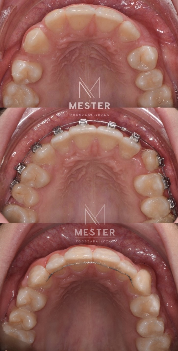 1. eset: Páciensük soron kívüli szemfoggal (ektópiás szemfog) érkezett hozzánk. Kezelését, ami 18 hónapig tartott, foghúzás nélkül végeztük Damon Clear esztétikus önligírozó rendszerrel.