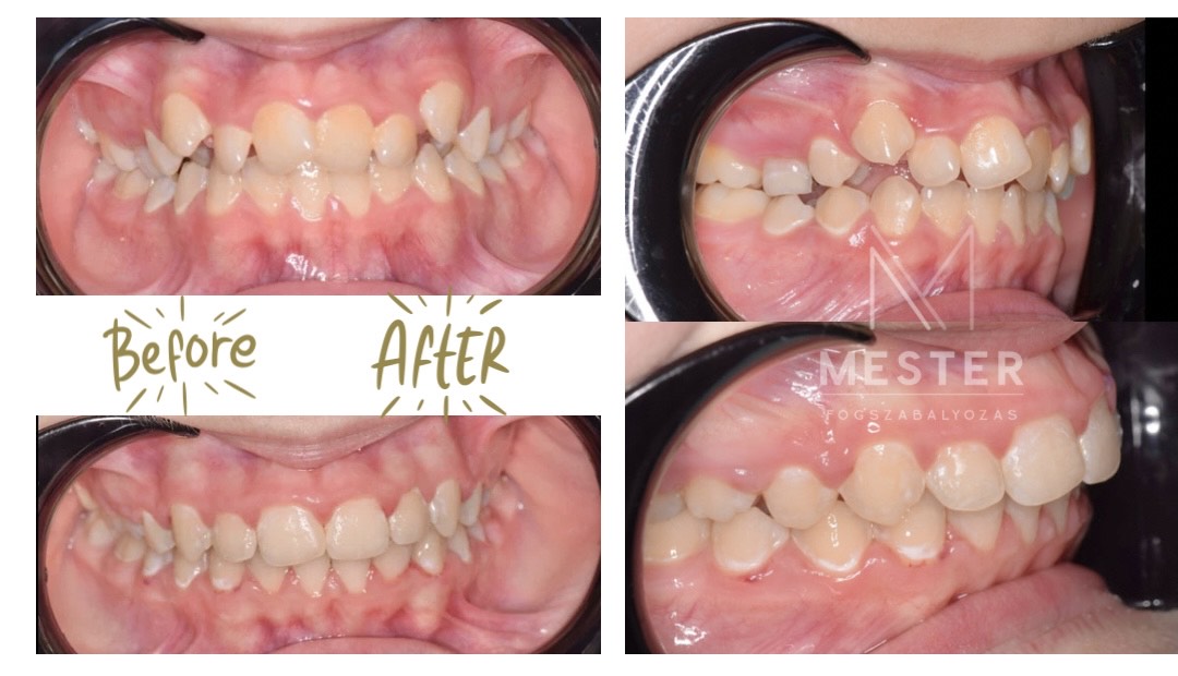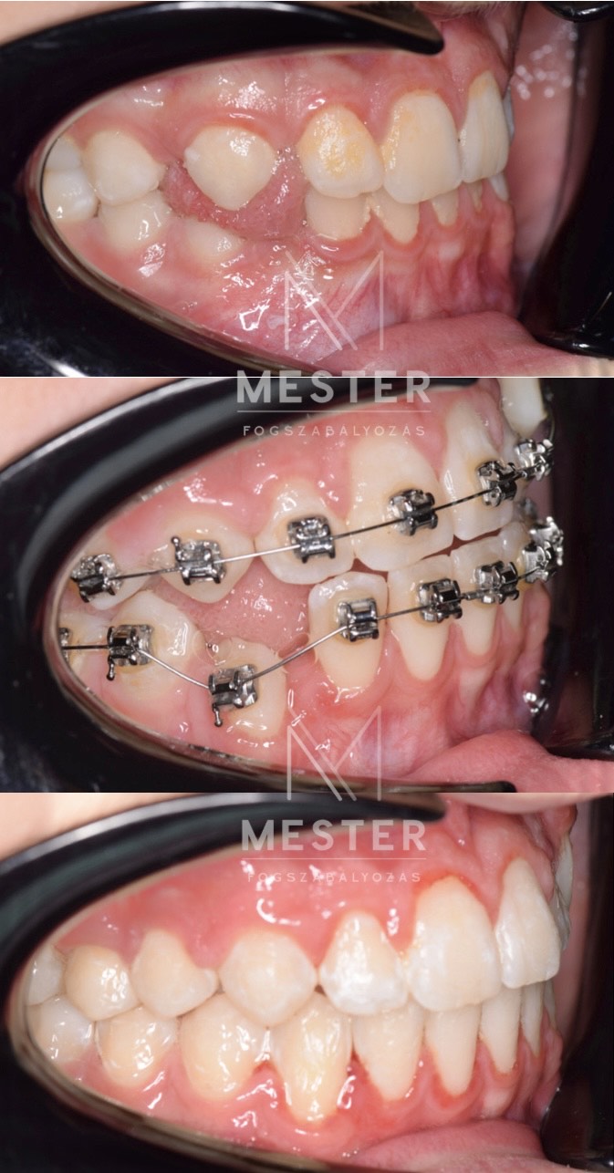 3. eset: Páciensük keresztharapással (ún. bulldogharapással) érkezett hozzánk. Állcsont műtét és foghúzás nélkül végeztük a kezelését, amely 16 hónapig tartott. Önligírozó fém rögzített fogszabályozó készülékkel kezeltük.